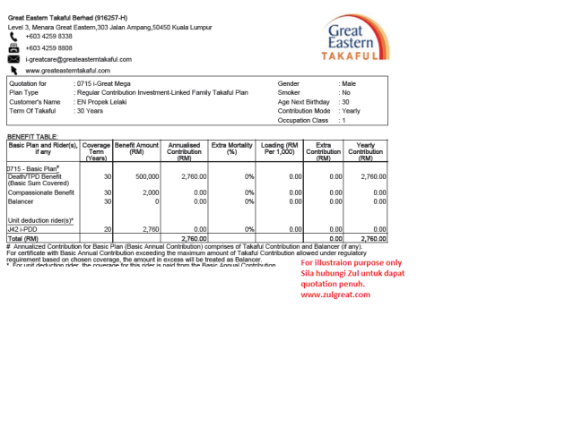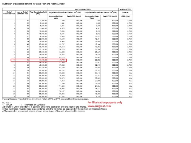Jika kita lihat melalui illustrasi quotation ini pada tahun ke 16 jumlah nilai tunai telah melebihi nilai caruman. Manakala nilai perlindungan masih kekal rm 500k sehingga 30 tahun. Inilah sesuatu yang baik.