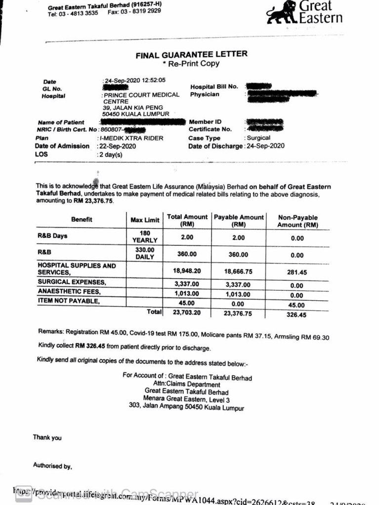 Dengan ada Plan Takaful boleh menerima rawatan di hospital yang selesa. Untuk kes client ini di Hospital Prince Court KL. Bill rawatan mencecah puluhan ribu. Kes ini juga memerlukan rawatan susulan. Syukur juga rawatan susulan juga pihak Great Eastern Takaful cover.
