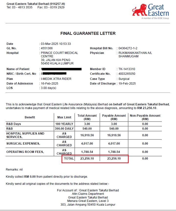 Saya terus menasihatkan beliau untuk terus ke hospital terdekat bagi mendapatkan rawatan segera. Tibanya di hospital yang terdekat, beliau disahkan patah dibahagian kaki. Oleh kerana hospital itu bukan panel kepada Great Eastern Takaful, saya memohon client untuk bertukar ke hospital panel. Dan client memilih ke Prince Court Medical Centre.
