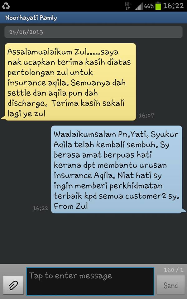 Sms dari Pn. Noorhayati yang berpuas hati dengan perkhidmatan saya. Syukur kepada Allah saya berjaya membantu dalam menguruskan claim anak beliau yang warded.