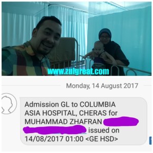 Alhamdulillah semalam Zul berjaya membantu menguruskan urusan GL Baby Zhafran warded di Colombia Asia Hospital. Kalau ikutkan Plan Medical Kad baby Zhafran baru sahaja sign up pada Mac 2017. Pada Ogos 2017 telah warded Claim (lebih kurang 5 bulan Plan Aktif). Zul doakan Baby Zhafran cepat sembuh. Amin