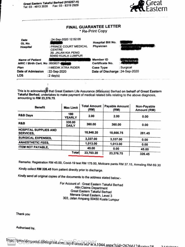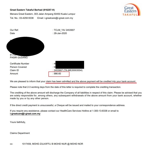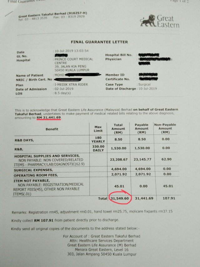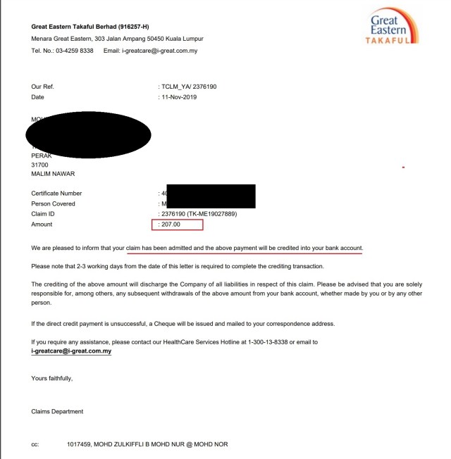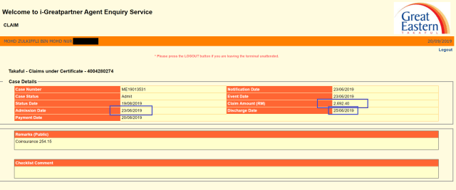 Alhamdulillah Zul berjaya uruskan Claim Nur Natasha Warded di Gleneagles Hospital pada Jan 2017. Bill rawatan beliau lebih Rm 8k selama 5 hari warded. Moga beliau cepat sembuh.