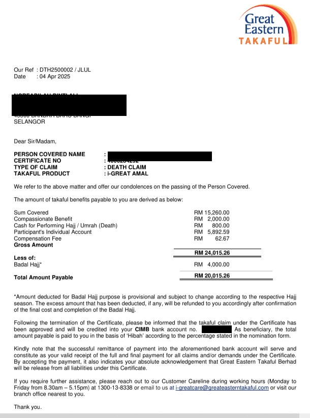 Saya teringat kembali. Pada tahun 2012 saya pernah membuka booth di jabatan kerajaan. Ketika itu saya bertemu dengan seorang insan lelaki. Saya mengajak beliau untuk mencarum dalam plan takaful. Pada ketika itu bajet beliau tidak tinggi. Beliau bersetuju untuk mencarum rm50 sebulan dan plan tersebut mempunyai manfaat badal haji, hibah untuk yang tersayang dan juga ada sedikit nilai simpanan (cash value selepas 20 tahun). Hujung tahun 2024 saya dimaklumkan oleh isterinya bahawa suami sedang kritikal di hospital putrajaya. Selang beberapa hari suami kembali kerahmatullah. Dengan plan takaful yang beliau sign up untuk yang tersayang, sy berjaya uruskan claim kematian. Anda boleh lihat jumlah claim ini. Walaupun tidak banyak. Tapi suami tetap menyediakan wang hibah untuk isteri yang tersayang.